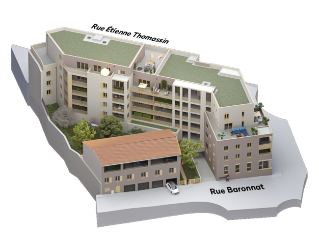 Vue du ciel, les trois bâtiments de la résidence forment un triangle à la jonction des rues Etienne Thomassin et Rue Baronnat.