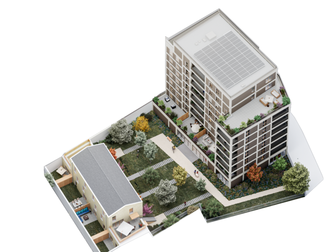 Répartie sur deux bâtiments (R+8 et R+2), la résidence s’organise autour d’un cœur d’îlot paysager de près de 850 m², véritable espace de respiration au centre du projet.